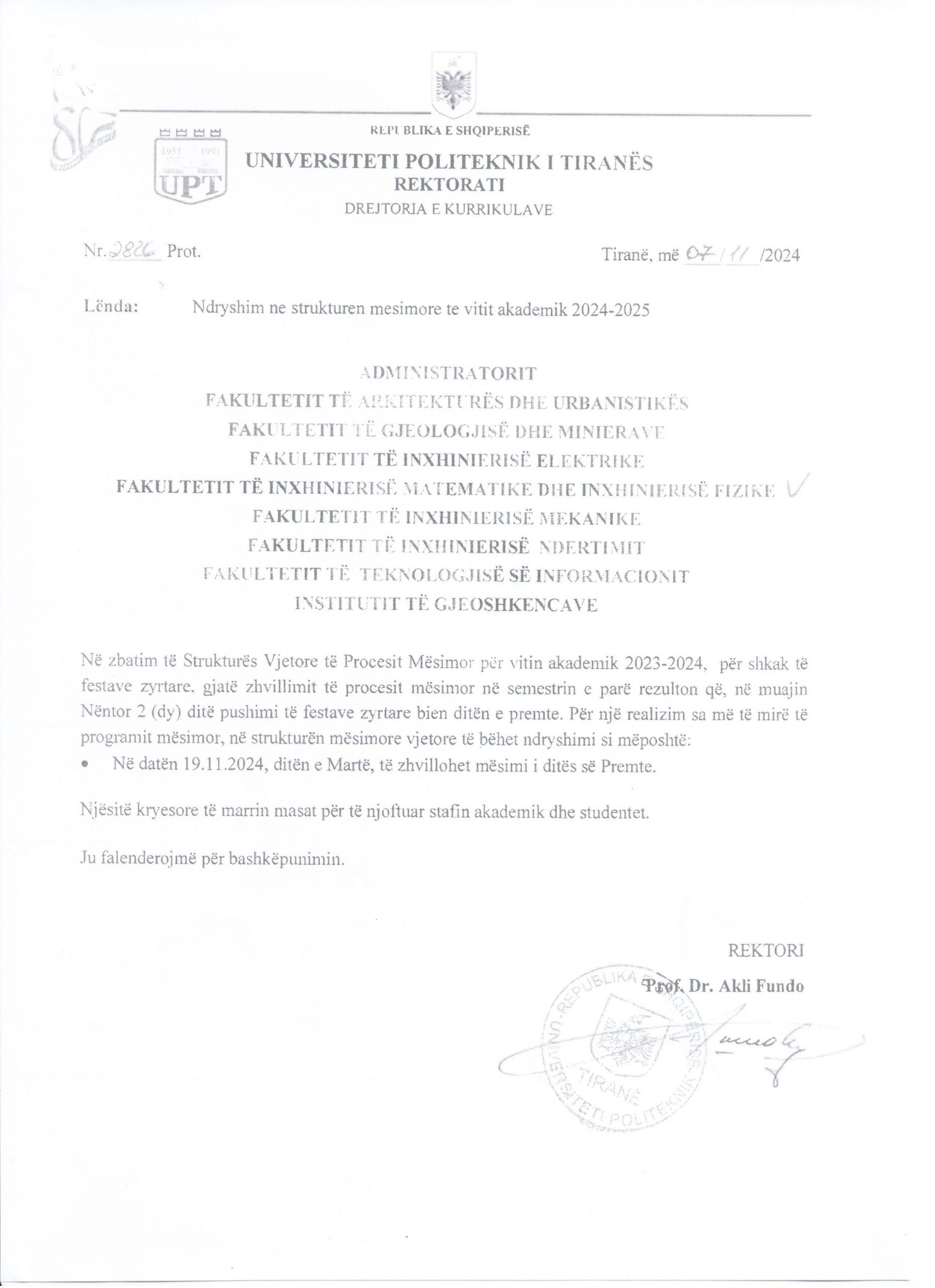 Njoftohen studentët e Universitetit Politeknik të Tiranës se, në vijim të Thirrjes së Tretë për krijimin