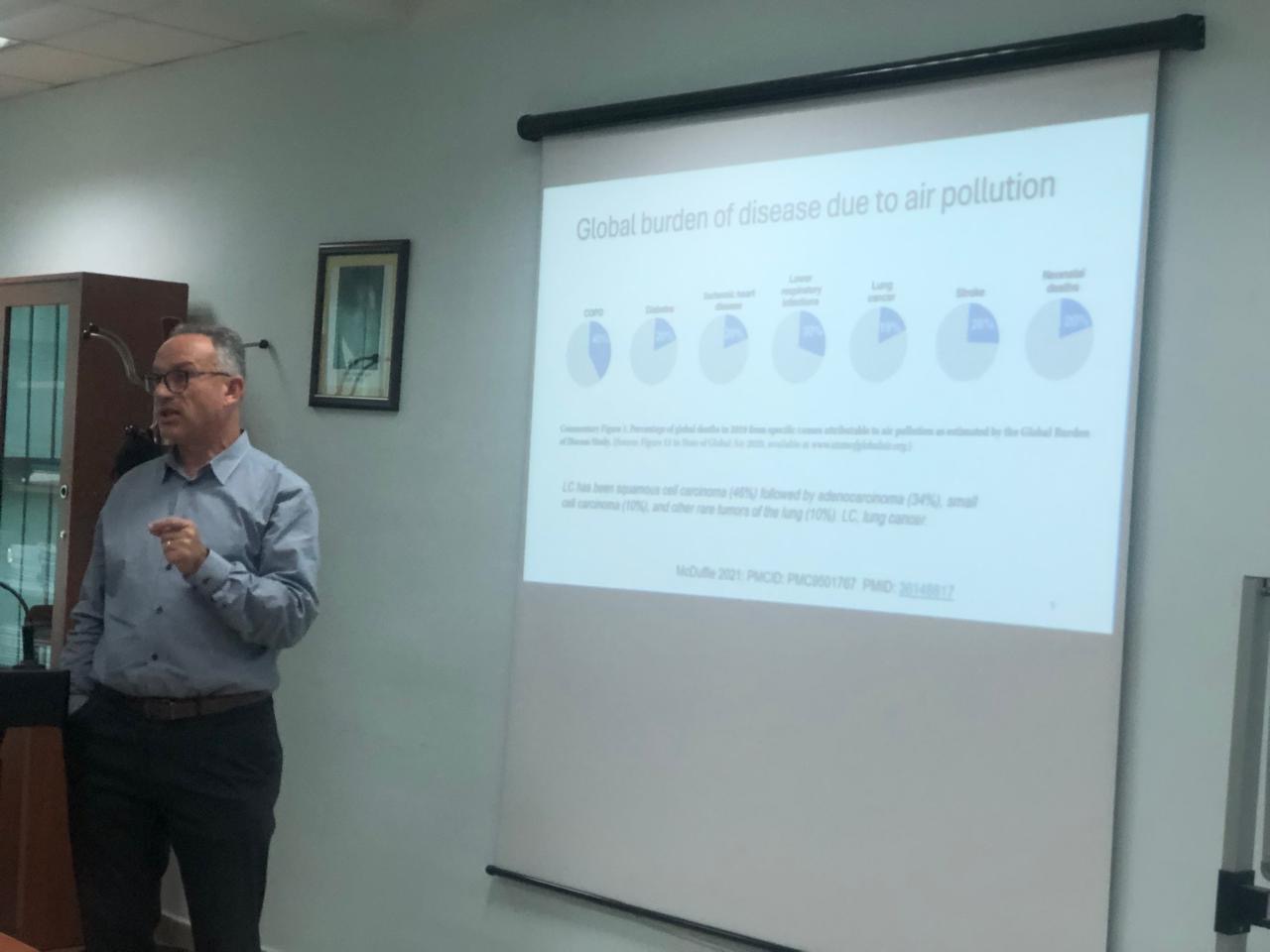 Ky prezantim interaktiv u përqendrua në paraqitjen e evidencës epidemiologjike, tashmë të qartë, për barrën globale të sëmundjeve të shkaktuara nga ndotja e ajrit (infeksionet e rrugëve të poshtme të frymëmarrjes, goditjet në tru, sëmundjet ishemike të zemrës, sëmundjet pulmonare obstruktive kronike dhe kanceret e mushkërive), e ndjekur nga rëndësia e saj për Shqipërinë. Prezantimi më pas zhvendosi fokusin në kiminë e ndotjes së ajrit, burimet e tij, ndotësit parësorë dhe dytësorë dhe bazën e indeksit të cilësisë së ajrit. Gjatë leksionit vëmendja u përqendrua në IQAir online për Shqipërinë bazuar në të dhënat e PM2.5. Vëmendje e veçantë iu kushtua ndotësve specifikë të rëndësishëm për Shqipërinë, duke përfshirë silicën kristalore nga aktivitetet intensive të ndërtimit, grimcat nga zjarret, djegia e gomave dhe mbetjeve bujqësore dhe djegia në mjedis të hapur e mbetjeve bashkiake. Leksioni trajtoi gjithashtu toksikologjinë mekanike të nanogrimcave të ambientit në ajër dhe burimet specifike të emetimit, biokinetikën e nanogrimcave në mushkëri dhe zhvendosjen në organet ekstrapulmonare, me theks të veçantë në rreziqet e kancerit dhe efektet epigjenetike trans-gjenerative të ndotjes së ajrit. Gjithashtu u prezantua projekti i ri i bashkëpunimit kërkimor- shkencor, në kuadër të Programit READ (Baraj + Bello), për ndikimin që kanë djegiet në mjedis të hapur në ajrin urban. Ky projekt synon ngritjen e kapaciteteve të kontrollit e monitorimit, si dhe ndërtimin e bazës së të dhënave për Shqipërinë. Toksikologjia dhe epidemiologjia e duhanpirjes patën një fokus të veçantë gjatë diskutimit. Leksioni përfundoi me një diskutim prej 30 minutash me studentët mbi zgjidhjet e mundshme, zgjedhjet që duhet të bëjnë dhe ndryshimet apo përmirësimet kulturore për ngritjen profesionale dhe rritjen në karrierë.